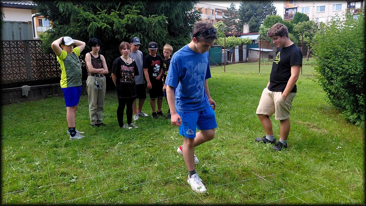 Pak jsme si vyrobili čtvercovou síť - močál, přes který jsme se snažili najít co nejrychleji cestu. Bojovala dvě družstva proti sobě, a bylo to jen tak tak!