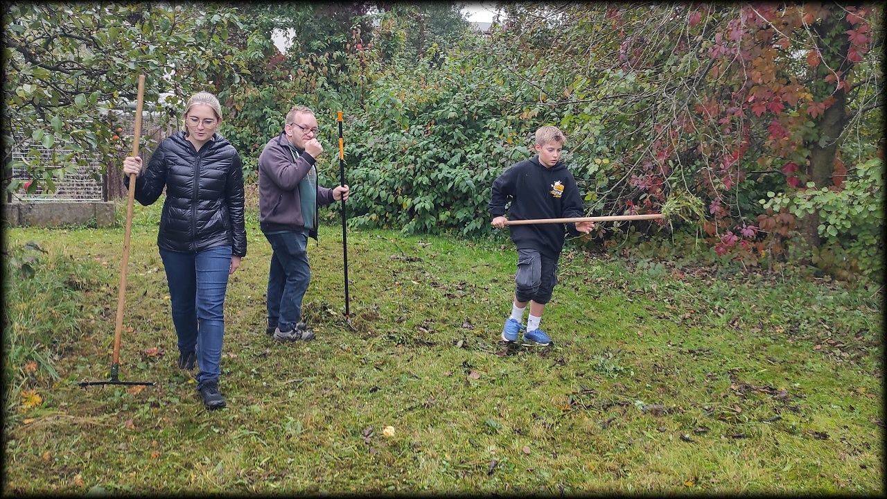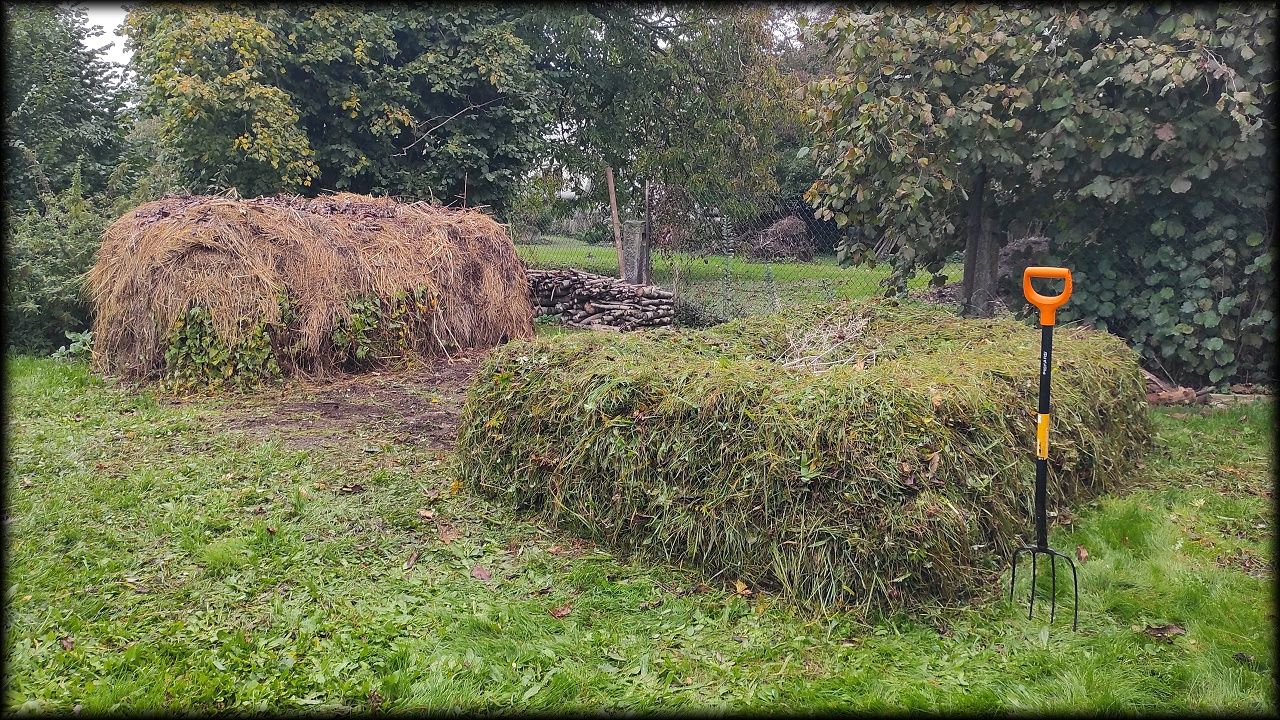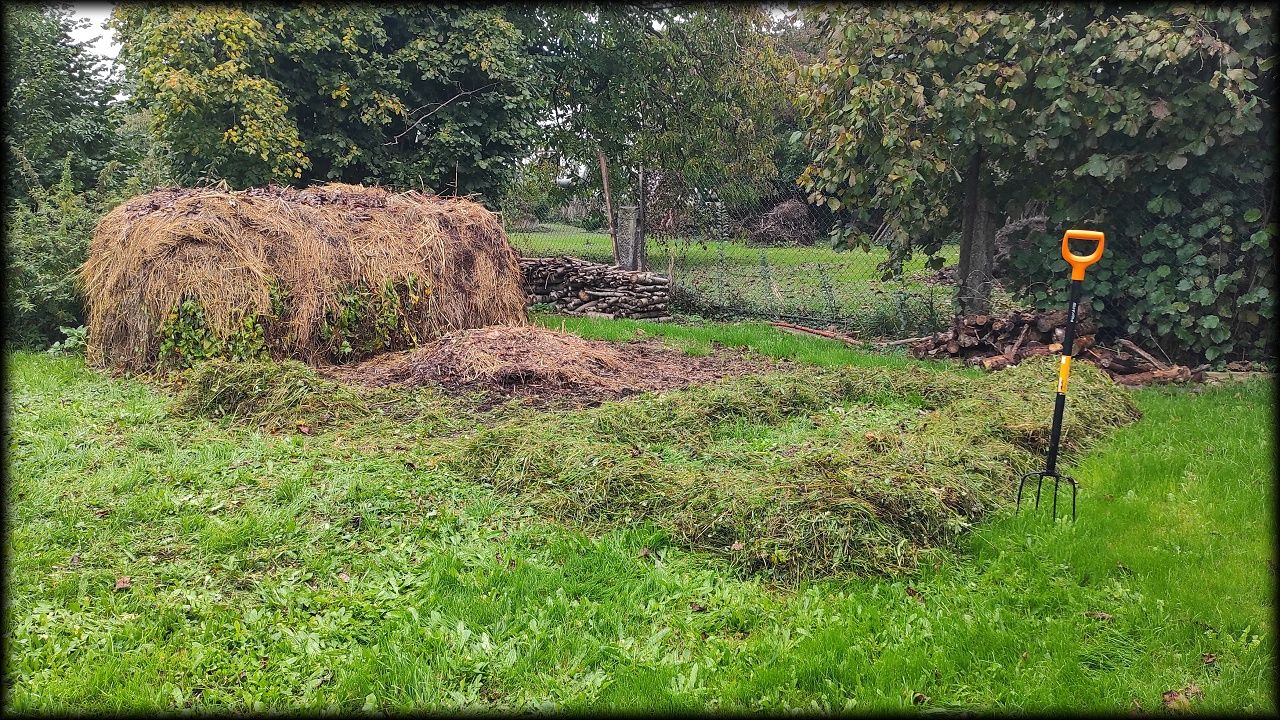 A vzhledem k tomu, že ji nikdo nechce na seno, a ostatně už ani není počasí na sušení (dnes dokonce drobně pršelo), končí tráva na kompostu. Materiál jsme použili na založení nové hromady, která poslouží pro příští sezónu. A jsme borci, zvládli jsme to dnes úúúúplně vše!