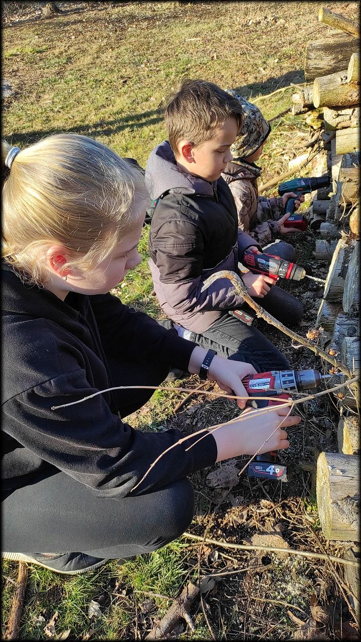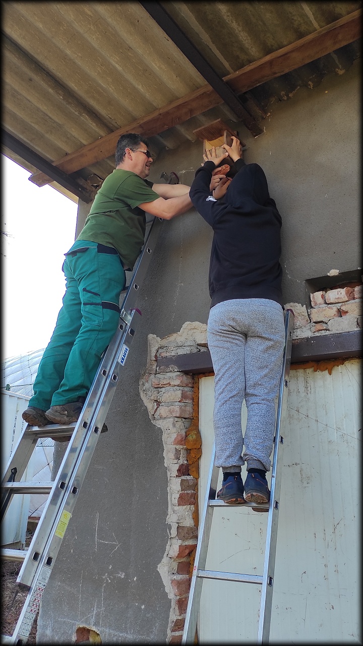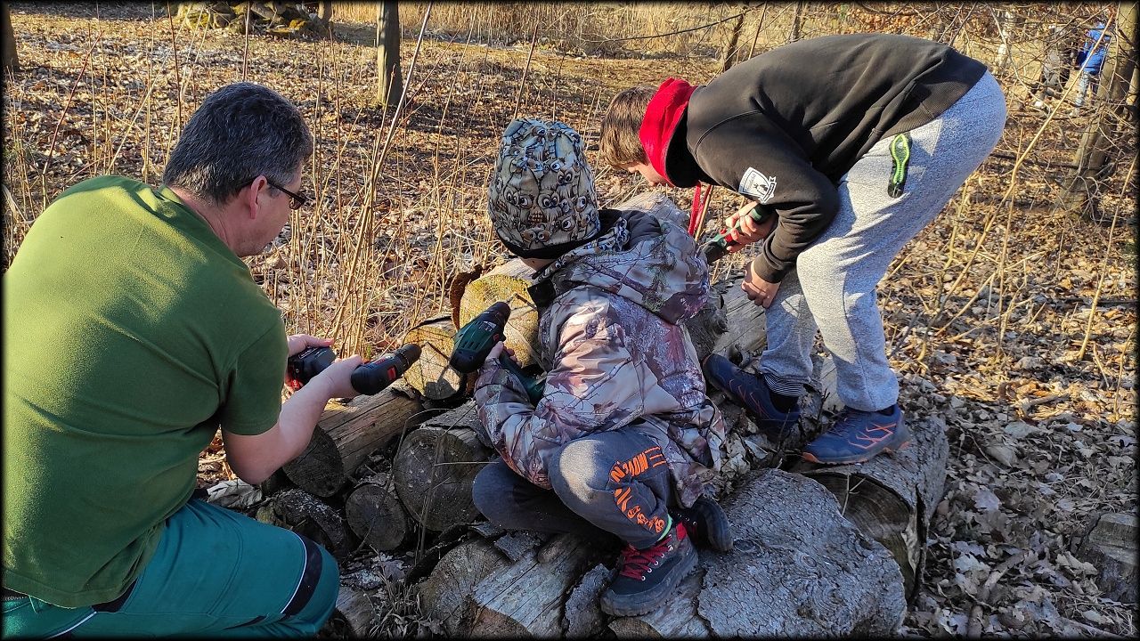 Pak jsme se přesunuli na prosluněný školní pozemek, kde jsme dočistili jezírko, vyvěsili poslední ptačí budku, určenou rehkům a díky ochotě tatínků, zapůjčit vrtačky, jsme vyvrtali spoustu dírek do hmyzího hotelu. Tatínkům děkujeme!