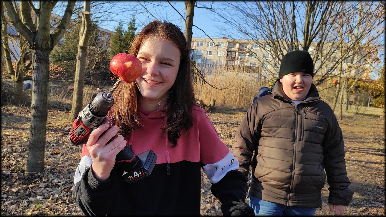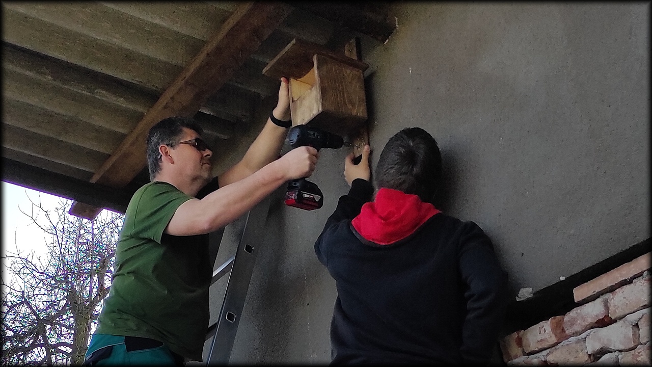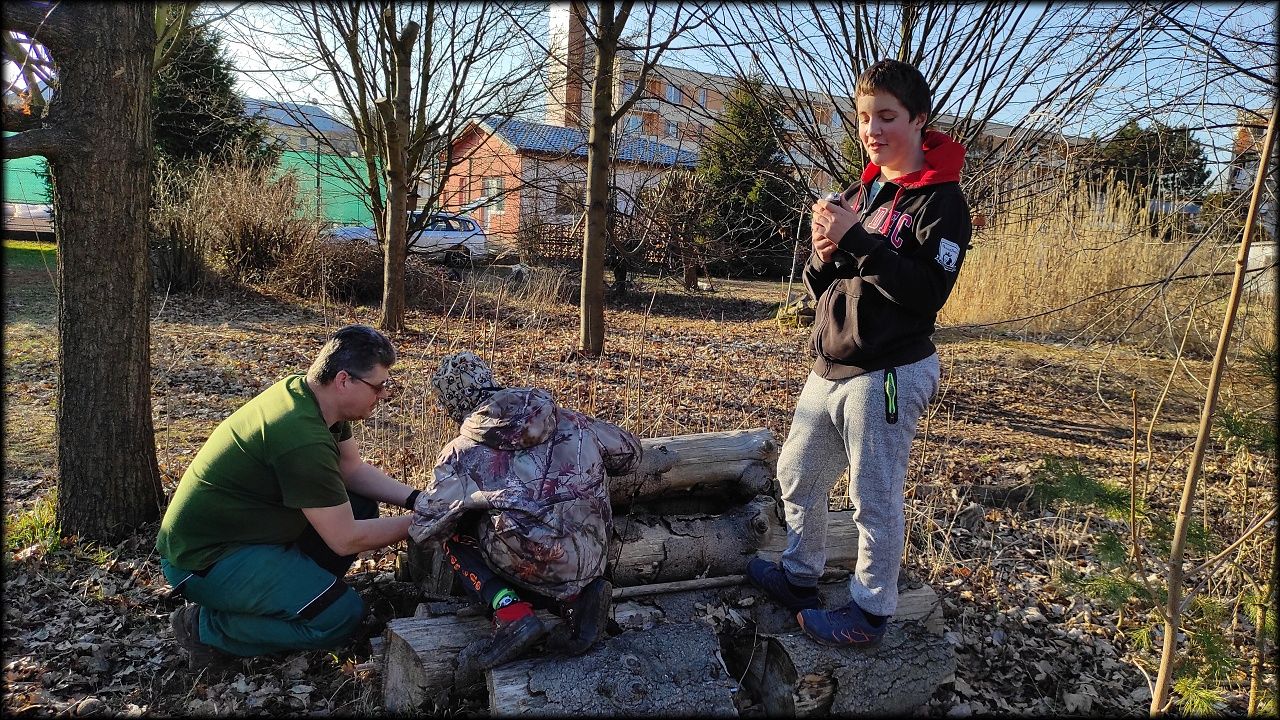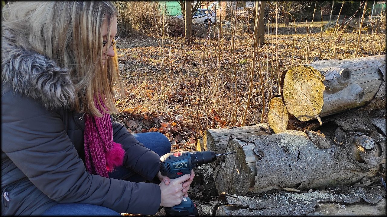 Pak jsme se přesunuli na prosluněný školní pozemek, kde jsme dočistili jezírko, vyvěsili poslední ptačí budku, určenou rehkům a díky ochotě tatínků, zapůjčit vrtačky, jsme vyvrtali spoustu dírek do hmyzího hotelu. Tatínkům děkujeme!