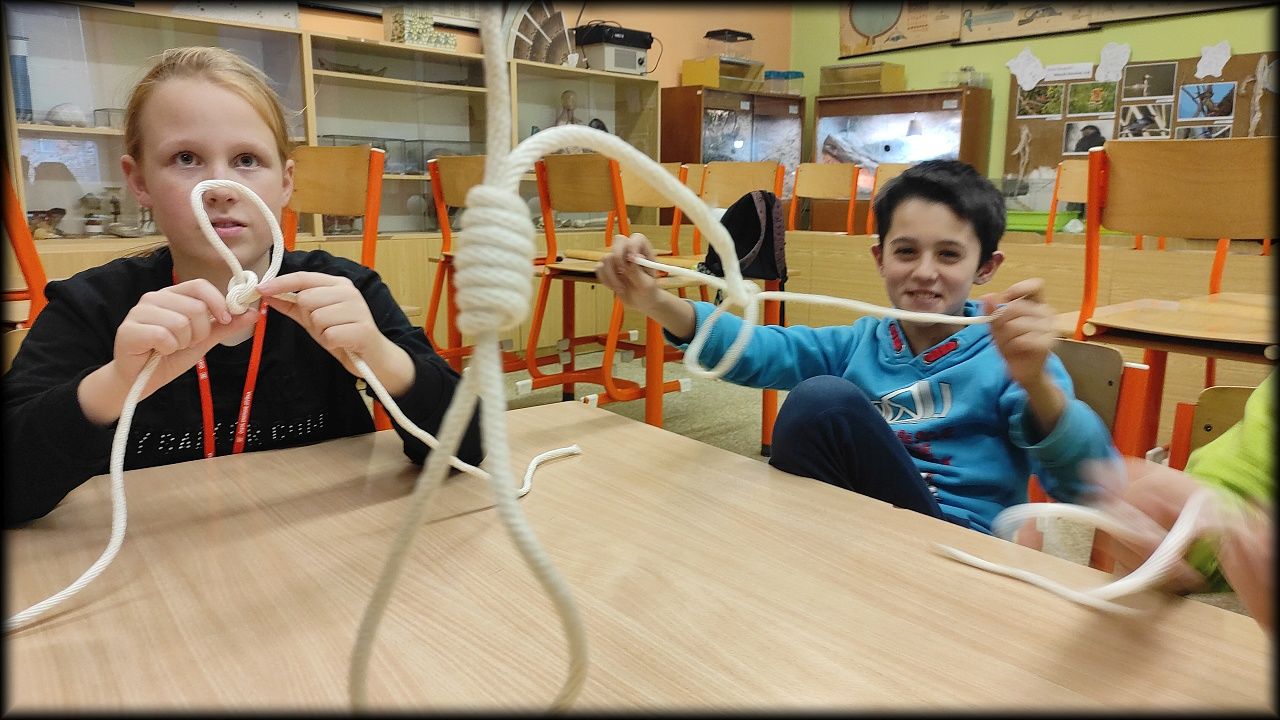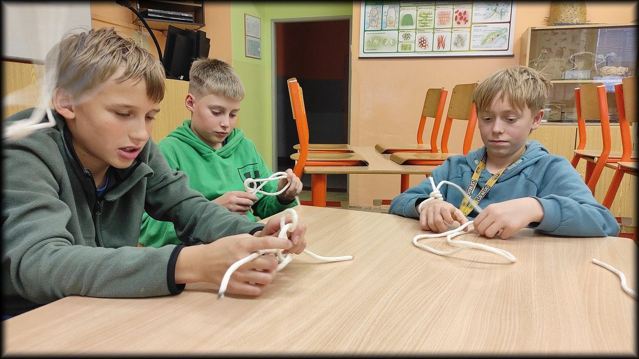 Ale hlavně jsme hráli hry. Tradiční poznávačku jsme doplnili i uzlováním, kde jsme uvázali pár základních uzlů. A nakonec jsme se zvedli ze židlí a honem, honem doplnili pár názvů přírodnin.
