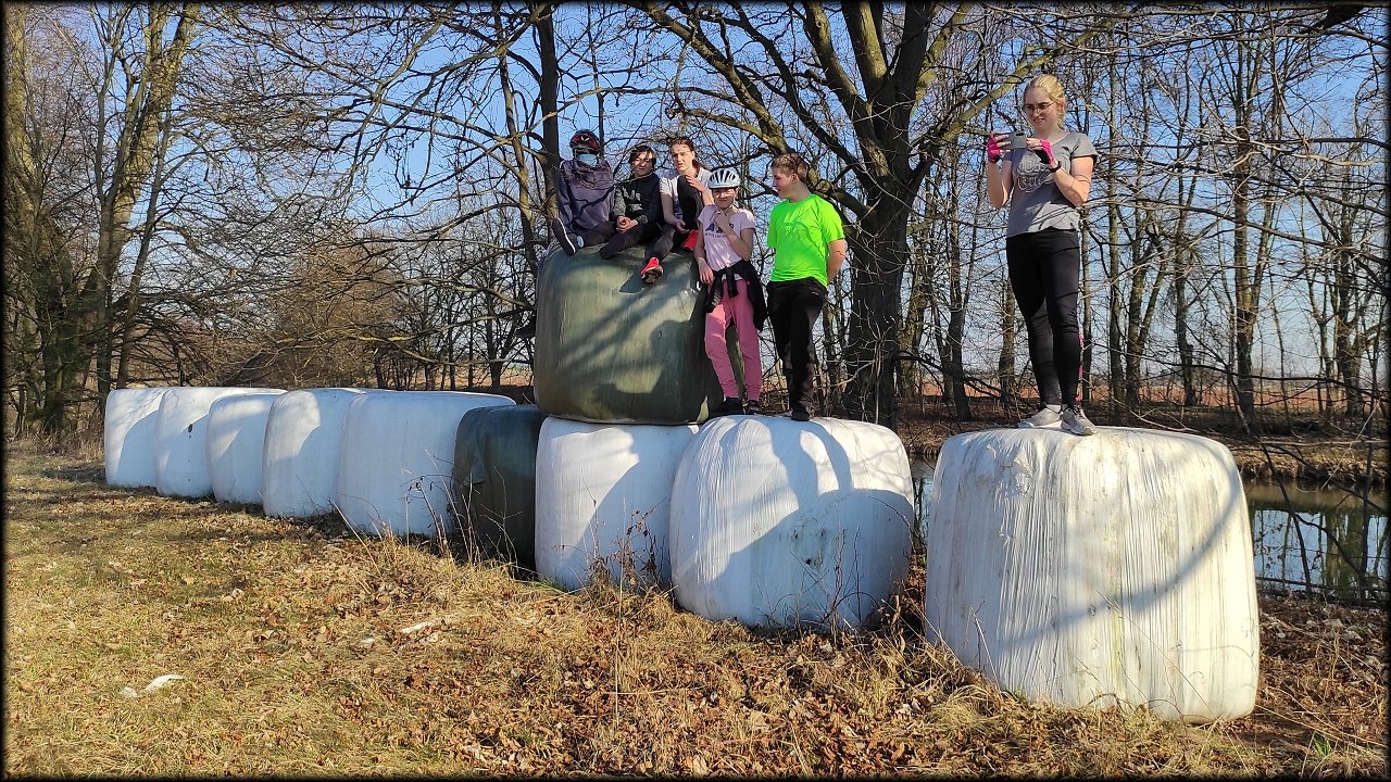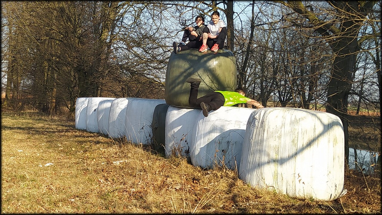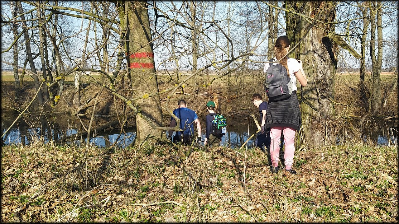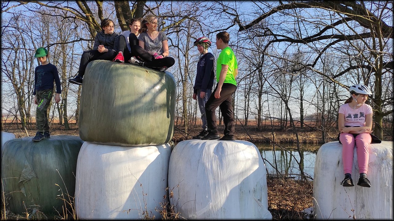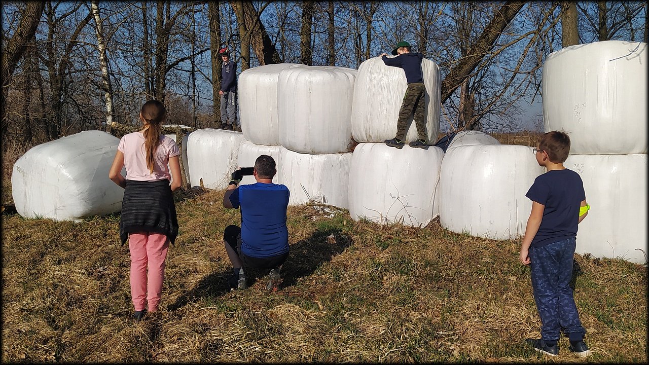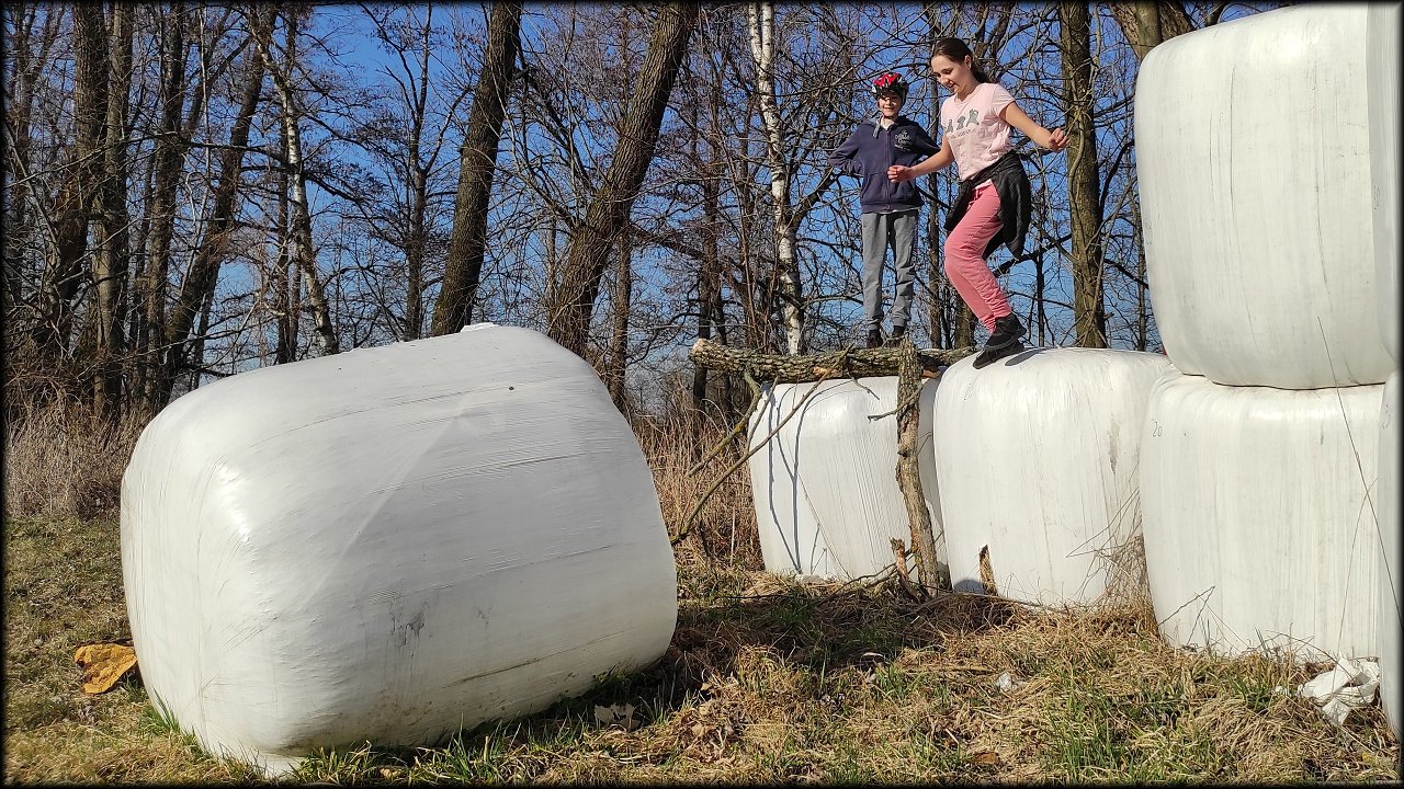 Po krátké zastávce u ústí Mlýnského náhonu jsme se přesunuli k přírodní památce Trotina. Tady jsme obdivovali nejen staré koryto Labe s takřka pralesními břehovými porosty, ale i složené balíky sena, které posloužily jako tělocvičné náčiní. Zaujala nás i budka spadlá na zem, která měla zazděný vletový otvor.