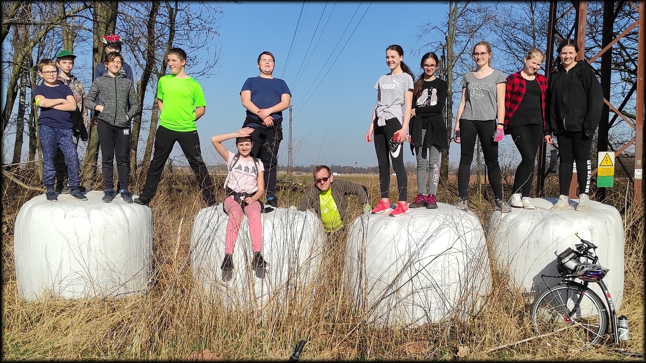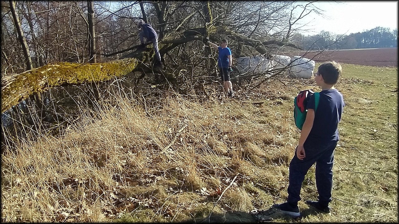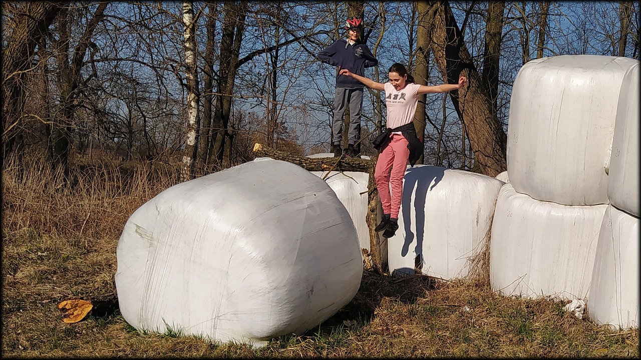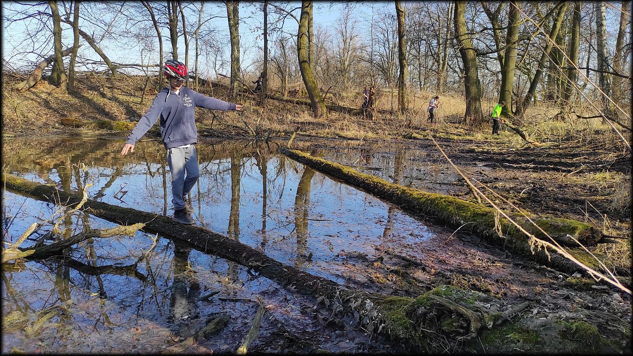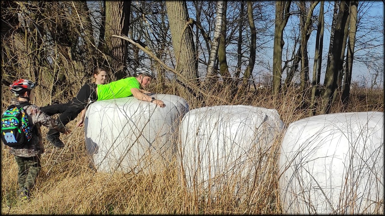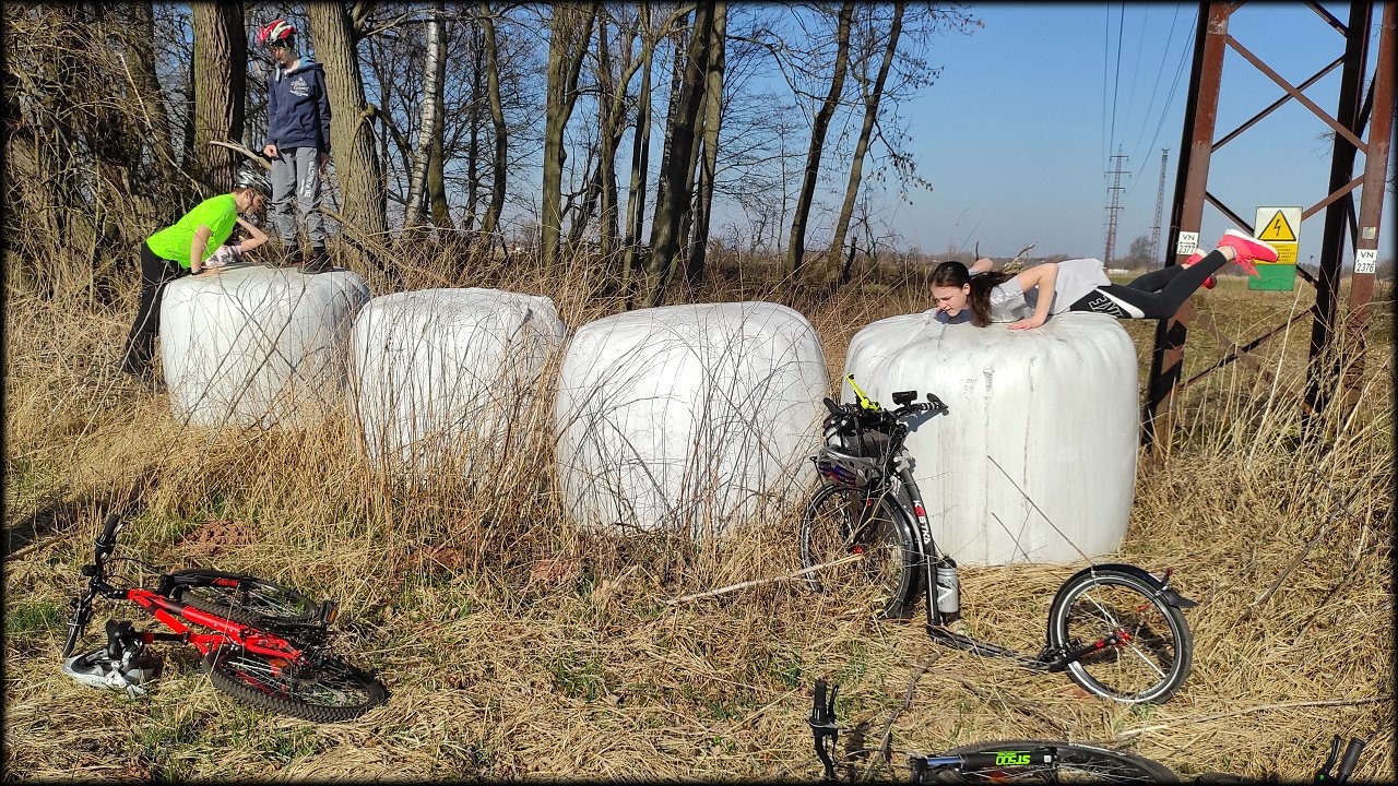 Po krátké zastávce u ústí Mlýnského náhonu jsme se přesunuli k přírodní památce Trotina. Tady jsme obdivovali nejen staré koryto Labe s takřka pralesními břehovými porosty, ale i složené balíky sena, které posloužily jako tělocvičné náčiní. Zaujala nás i budka spadlá na zem, která měla zazděný vletový otvor.