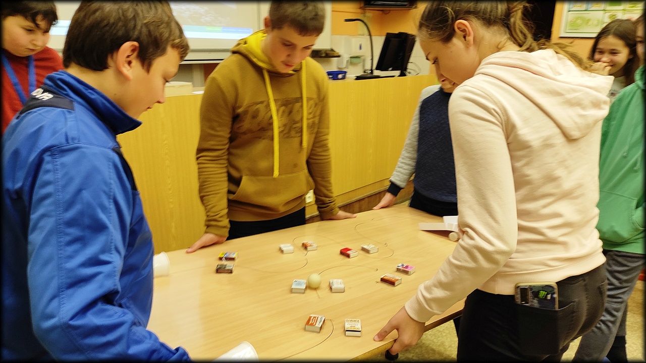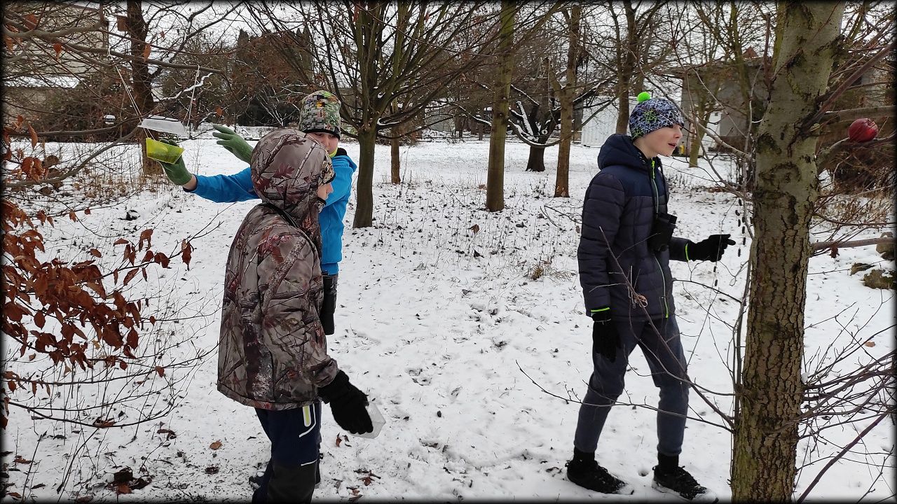 Nejdříve jsme obstarali krmítka na pozemku a naše zvířata ve škole. Holky naplnily tukové krmítko a připravily ho tak na opětovné vyvěšení, nakrmili jsme hady, gekončíky a agamy, vyčistili hlodavce, poklidili u achatin, ... Zkrátka, udělali jsme, co bylo třeba. A teprve potom jsme se pustili do soutěžení.