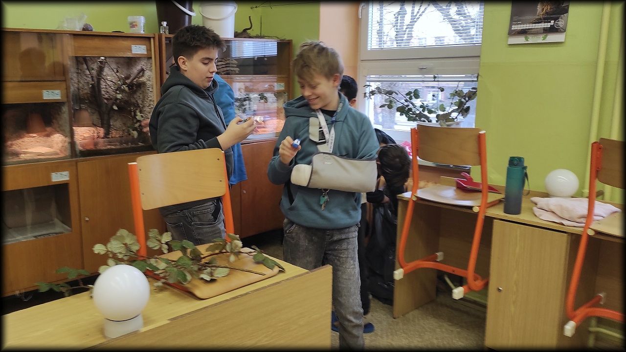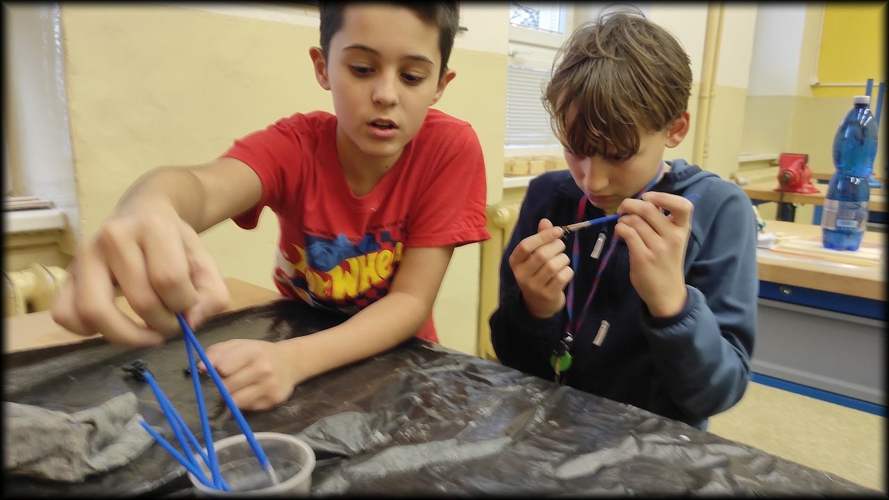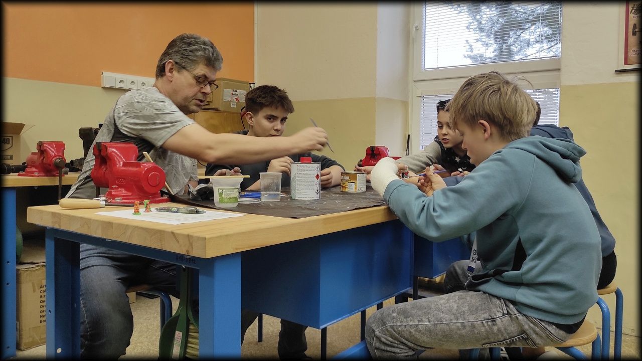 Nejprve jsme však zase obstarali venkovní ptactvo. Pak jsme se pustili do lakování bezbarvým lakem. Ten by měl povrch hracích figurek dostatečně ochránit. V mezičase, kdy lak usychal, jsme se postarali o koutek živé přírody a také uklidili klec po samičce potkana, která o víkendu zemřela stářím. A ještě jsme si zahráli poznávačku!