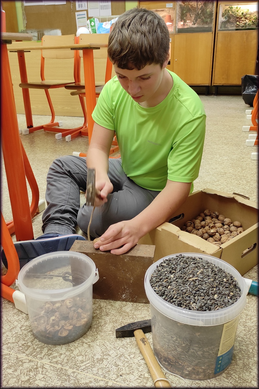 Ano, ano, proticovidová opatření nám pro dnešek značně zredukovala členskou základnu. Když k tomu přidáme pracovní a školní vytížení dalších vedoucích, zbyli jsme opravdu jen dva! Přesto jsme se sešli, abychom zahájili přikrmování ptáků na pozemku.