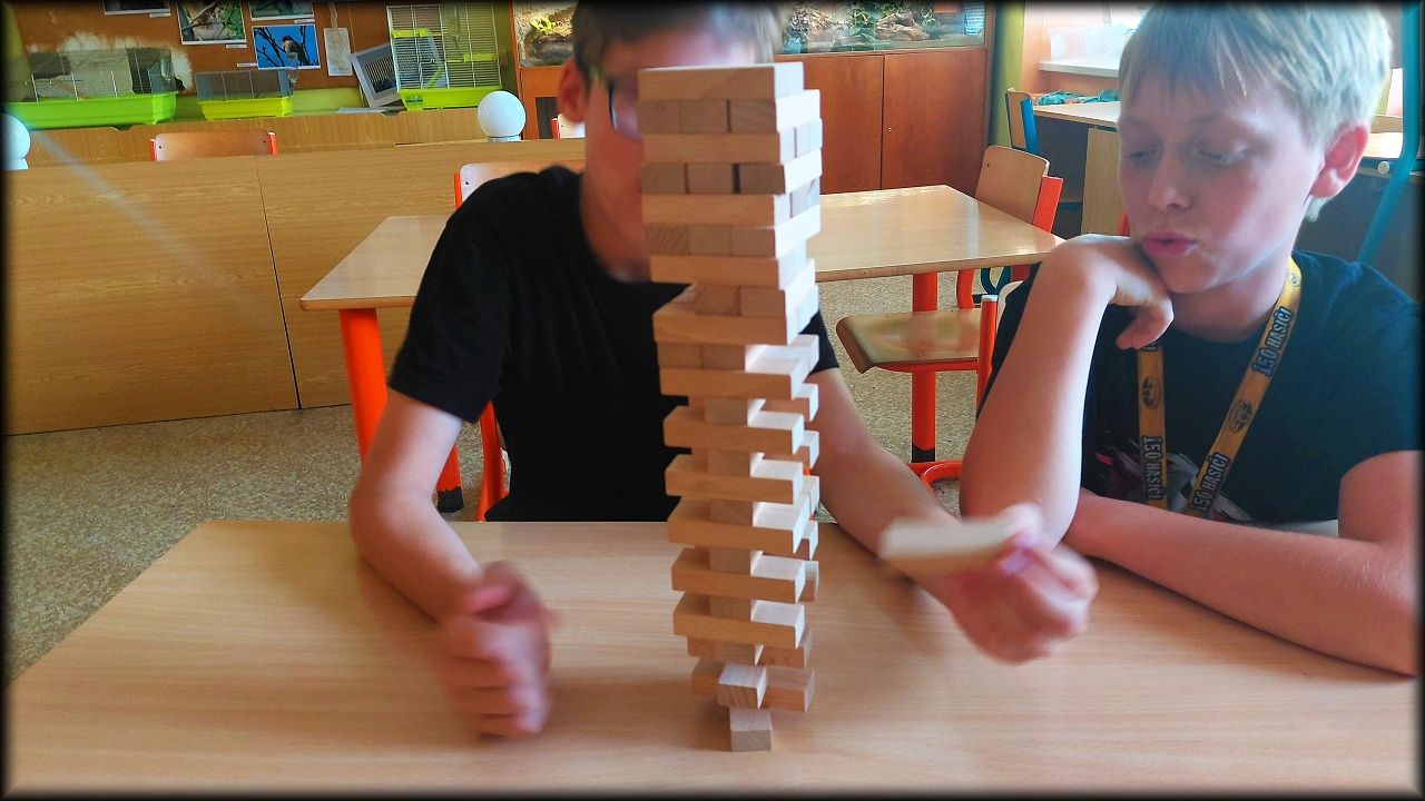 Hadům to ale na chuti nesebralo. Po obstarání zvířat jsme si ještě zahráli Jenga věž.