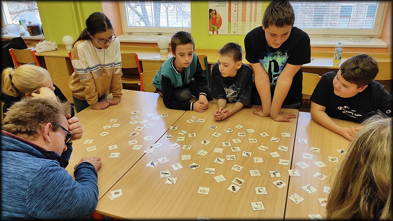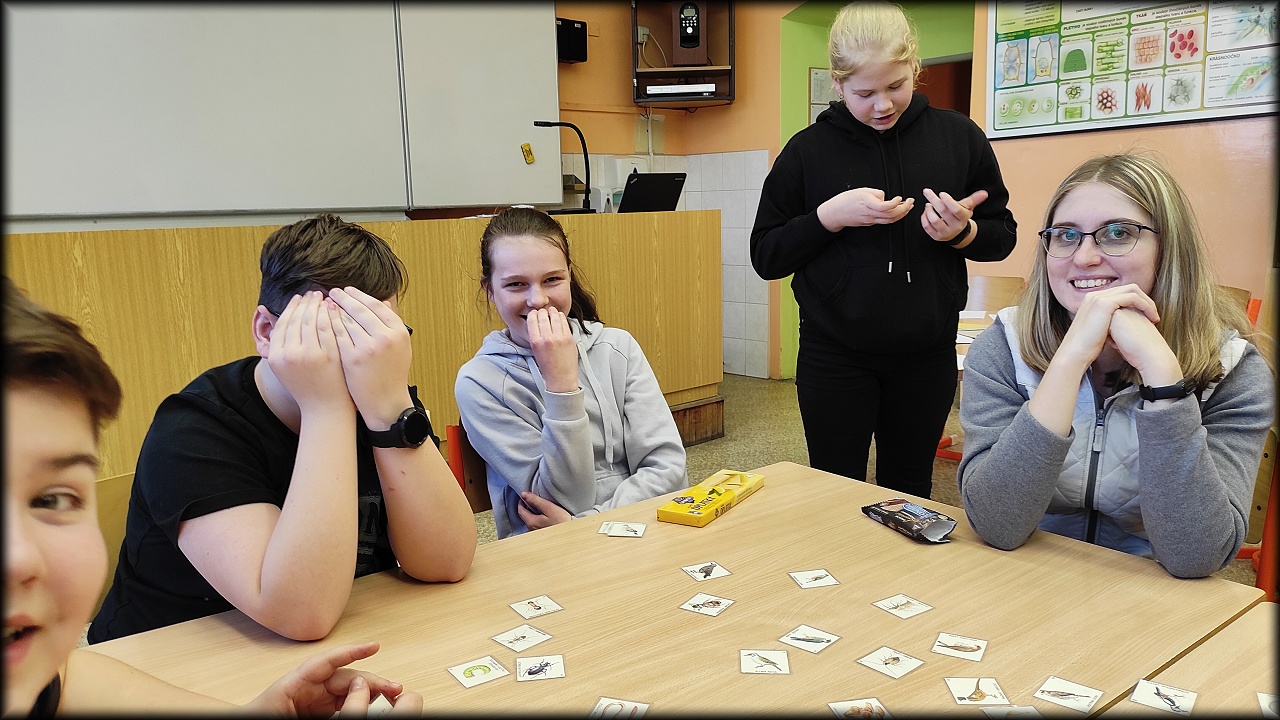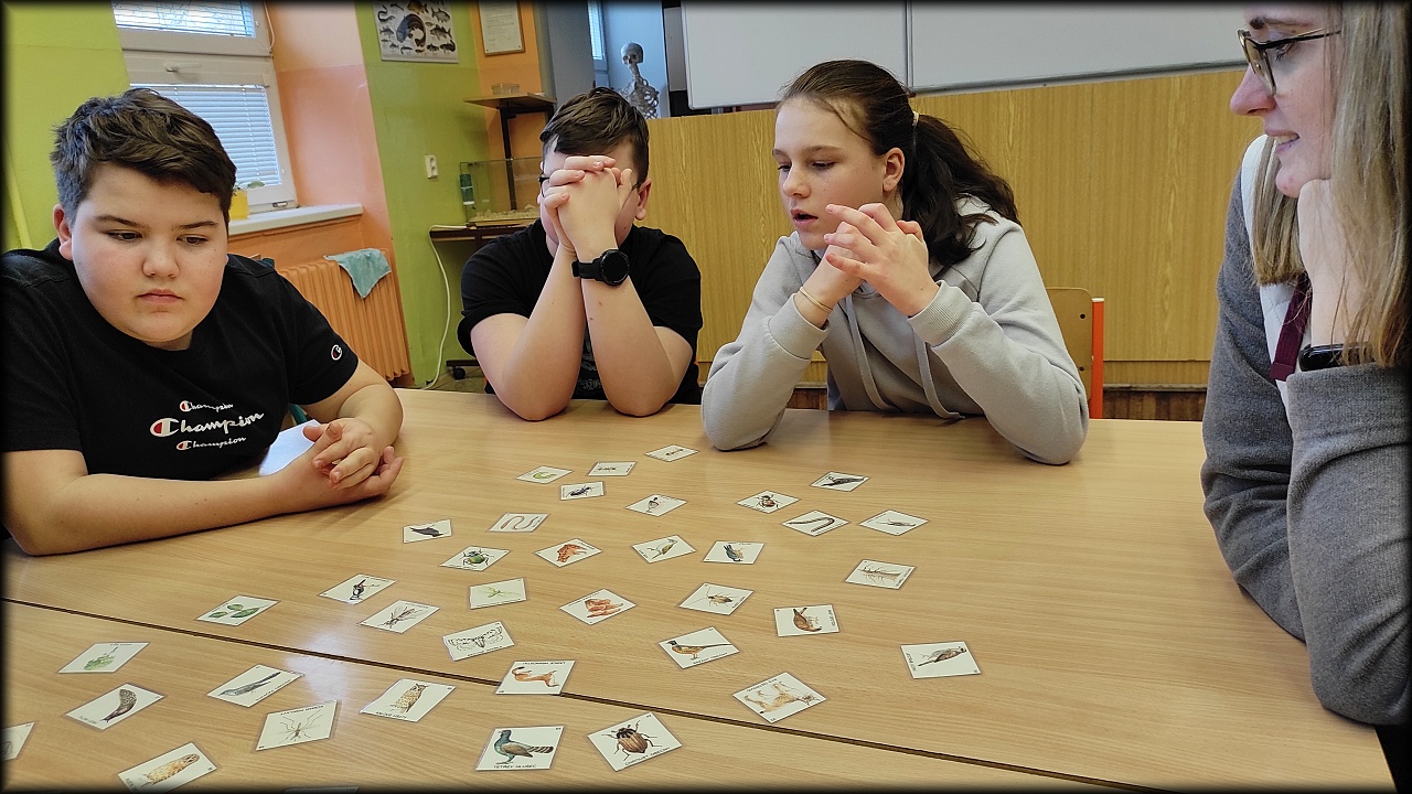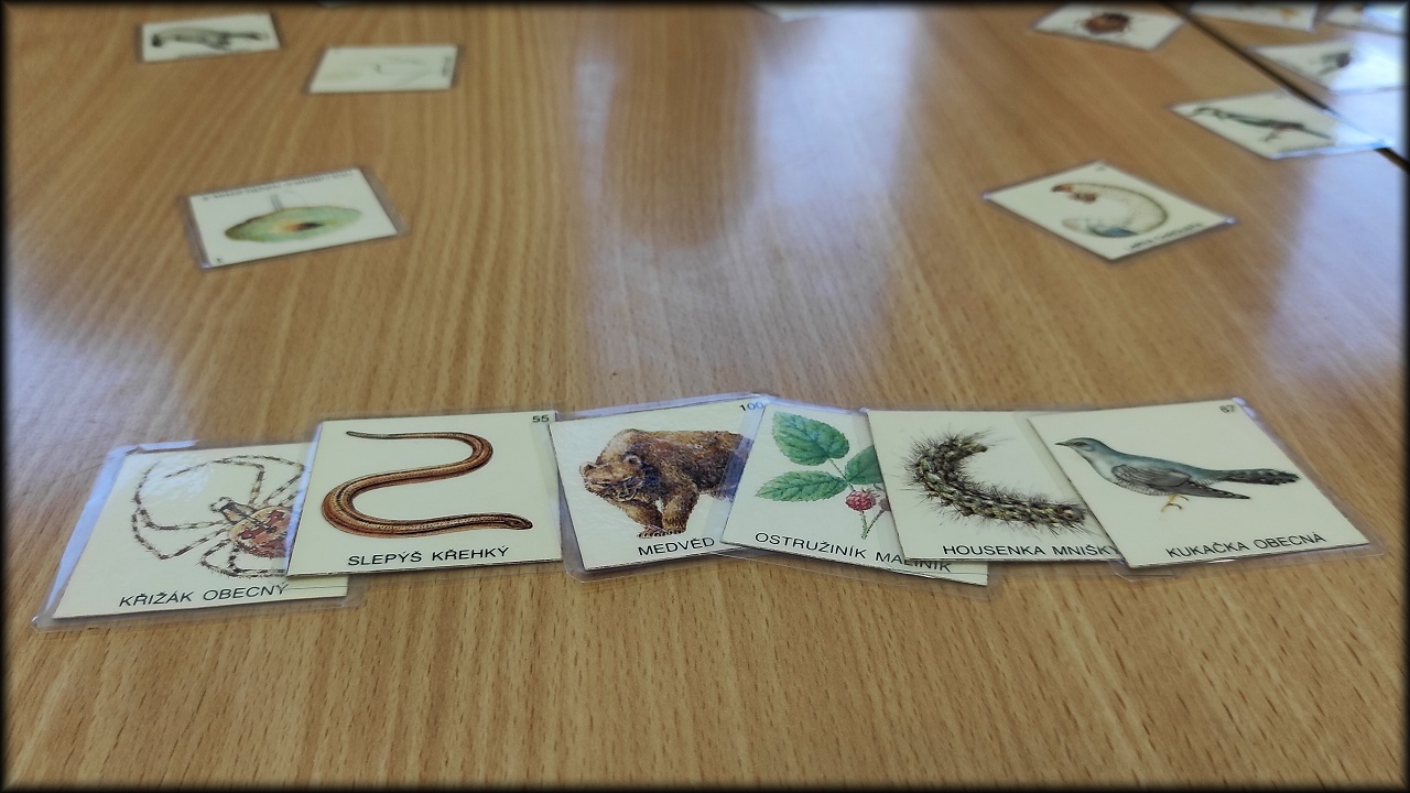 Ale než jsme se tam dostali, nejprve jsme se stavili na pozemku dosypat krmítka pro ptáky a vzít ostružiny pro strašilky. Po obstarání našeho koutku živé přírody jsme svedli nelítostný souboj s pamětí. Museli jsme nejen poznat rostliny a živočichy, ale navíc si zapamatovat jejich pozici na herním poli. No, nebylo to jednoduché!