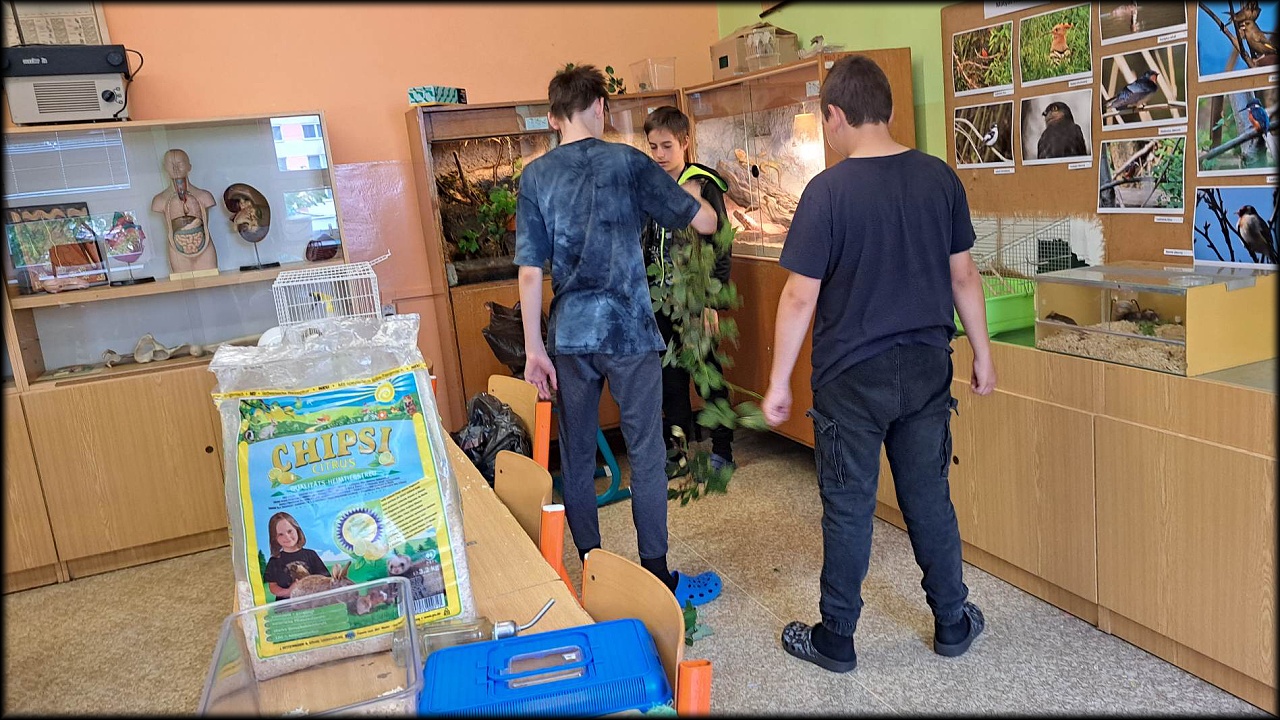 Ale pro velmi nepříznivou předpověď počasí bylo posunuto na pondělí 22.5. Tak jsme se sešli ve škole a dali do pořádku terária. A protože se předpověď částečně mýlila, vyrazili jsme nakonec ještě na pozemek poznávat rostliny. Připletlo se nám do cesty i pár živočichů.
