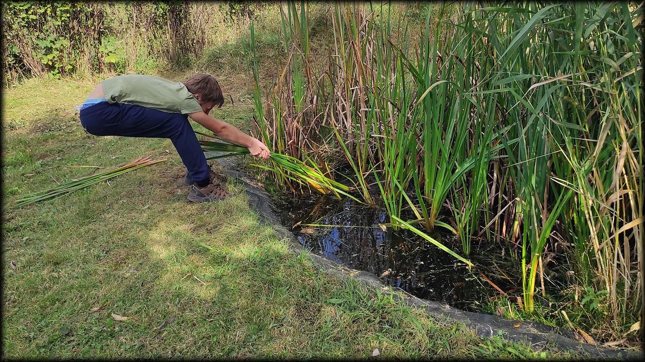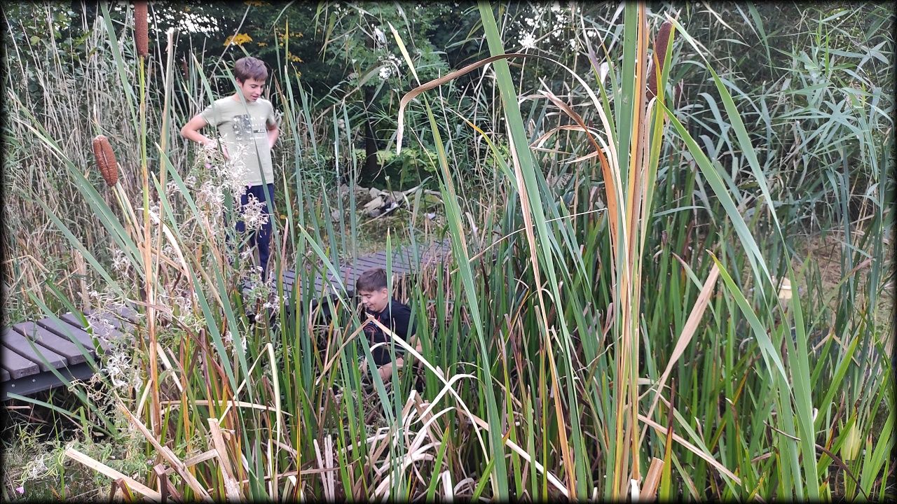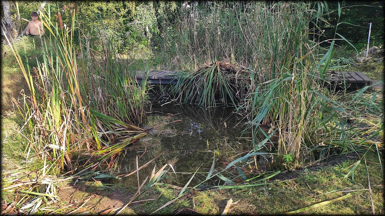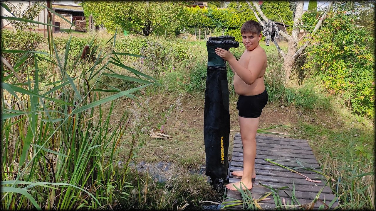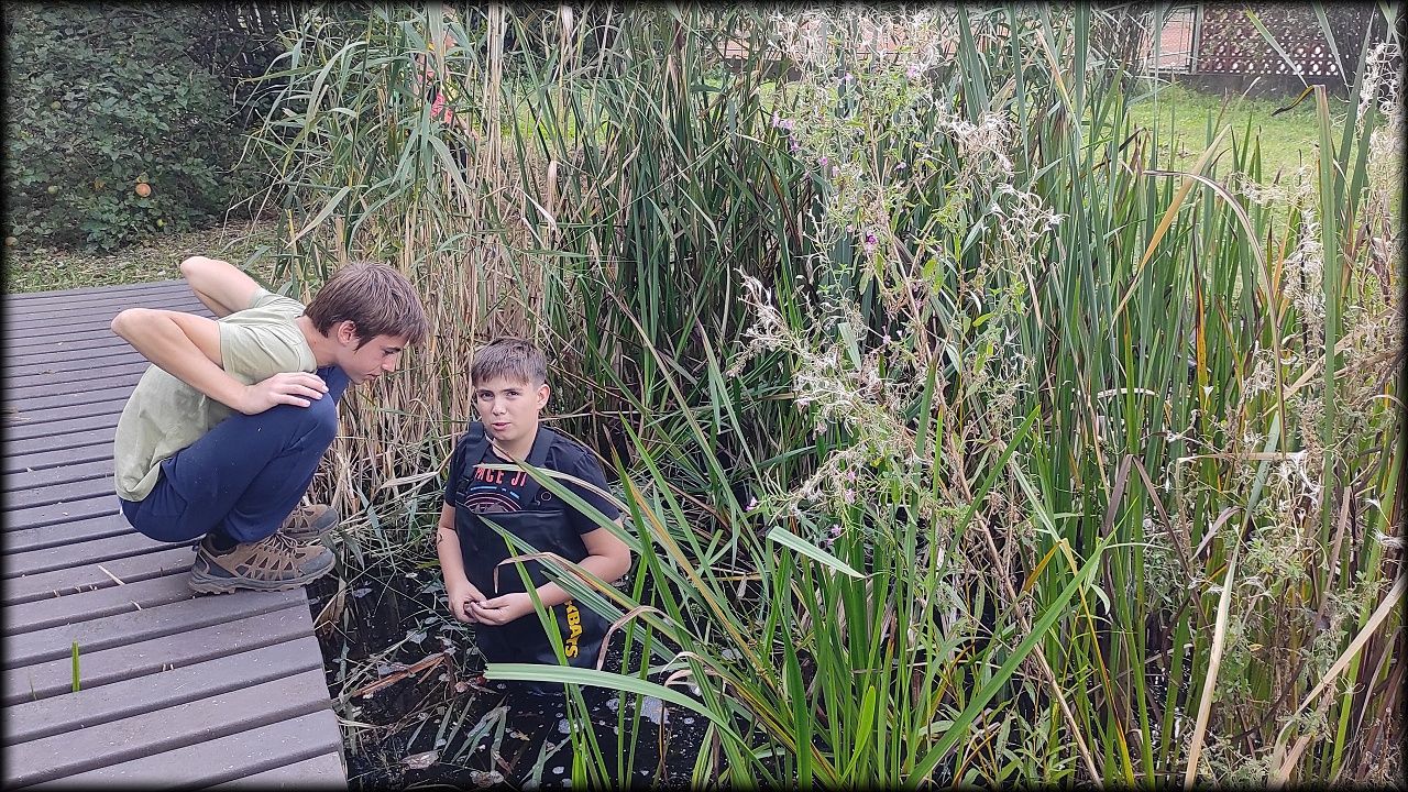 Posekali jsme a pohrabali trávu, tak to tu zase pěkně prokouklo. Navíc jsme se pustili do údržby jezírka. A šlo nám to pěkně od ruky i díky Domčovým novým broďákům. Domčo, děkujeme.