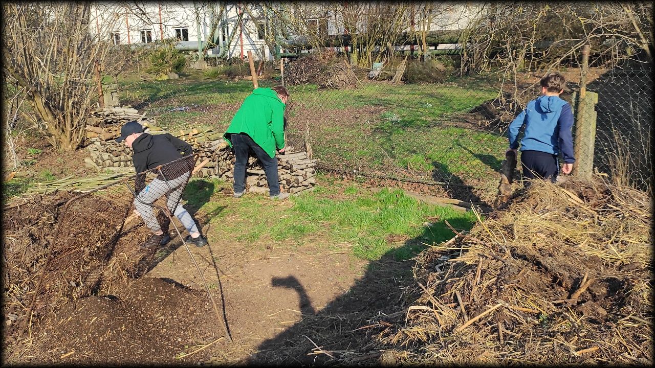 Pak jsme se přesunuli na pozemek, zkontrolovali šachtu a pustili se do práce. A je to za námi opět vidět! Z jezírka zmizela část vegetace, překatrovali jsme většinu kompostu a dorovnali hromadu dřeva na oheň.