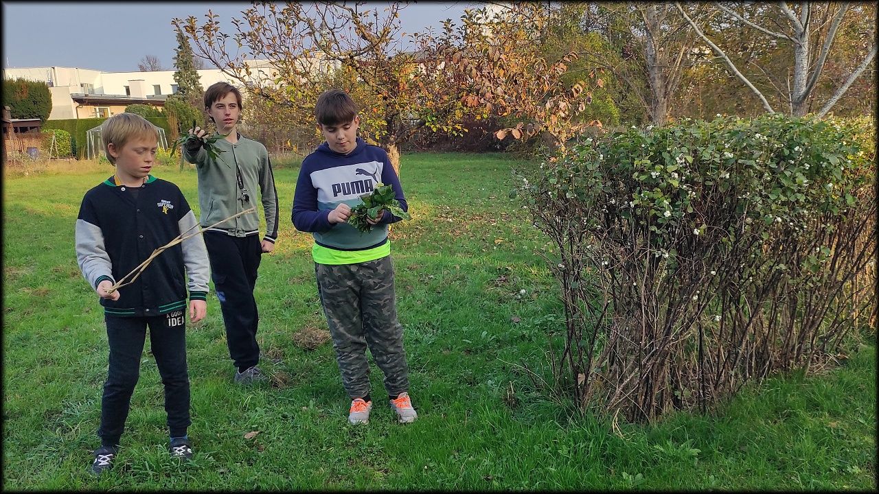 Pak jsme si odskočili zpět do školy, abychom obstarali u zvířat to, co jsme zanedbali. Z pozemku jsme jim donesli čerstvé krmení.