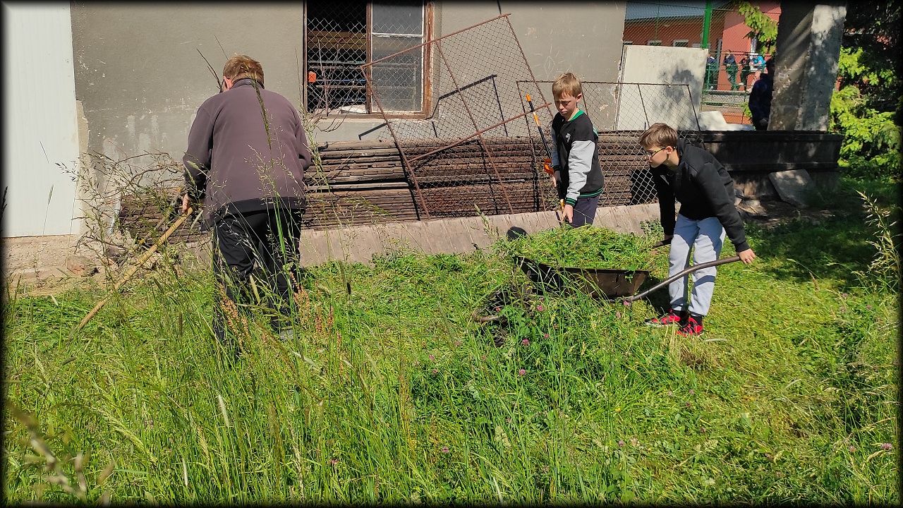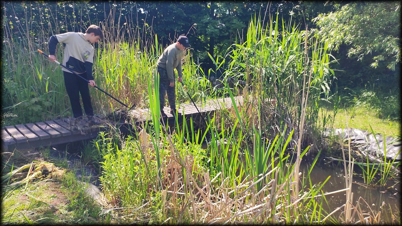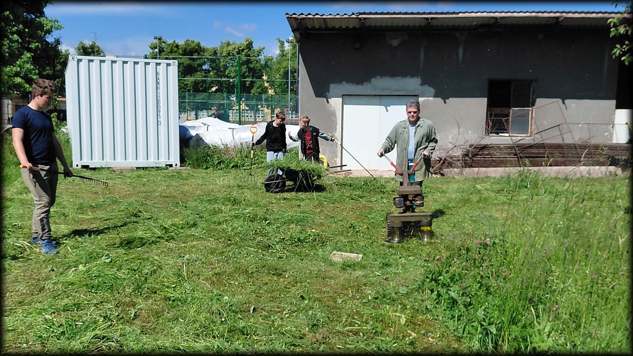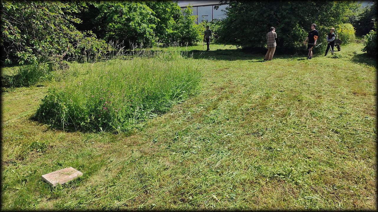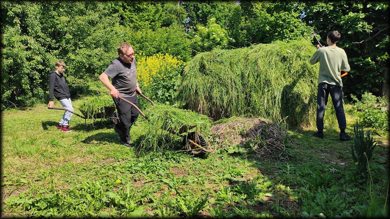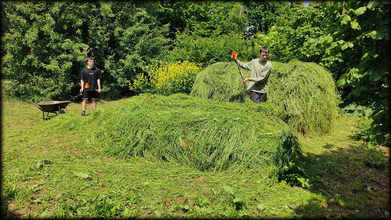 V sobotu ráno jsme vyrazili na pozemek posekat a uklidit trávu. A protože se nenašel nikdo, kdo by si ji chtěl usušit, skončila všechna na kompostu. Tedy, skoro všechna. Zbytek doklidíme příště. Kluci navíc stihli vyčistit jezírko od plovoucích řas. No, odvedli jsme pořádný kus práce!
