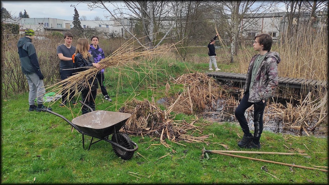 V sobotu ráno uklízíme hromady kolem jezírka, a protože je oproti předpovědi déle pěkné počasí, uklízíme i ostříhané větve jabloní. Ještě před deštěm se přesouváme do školy a snažíme se vybudovat co nejdelší cestu, z minima materiálu, přes chráněný mokřad. A úplně na závěr připravujeme učebnu přírodopisu na zítřejší 3D fotografování.