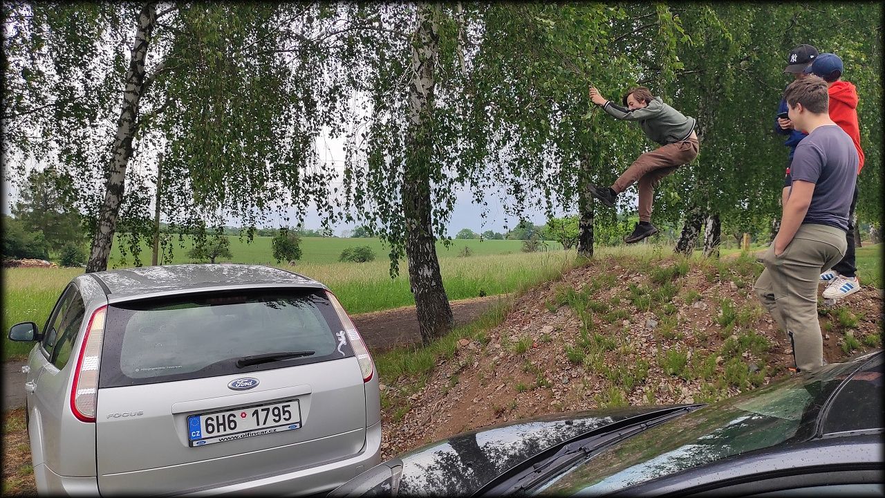 V sobotu ráno bylo všechno jinak. Na rychlo měníme dopravní prostředky a rozhodujeme se jet nakonec auty. No, ty mraky na radaru ... A protože tím vlastně získáme trochu času, věnujeme ho částečně Geocachingu. A cestou si odlovíme pár keší.
