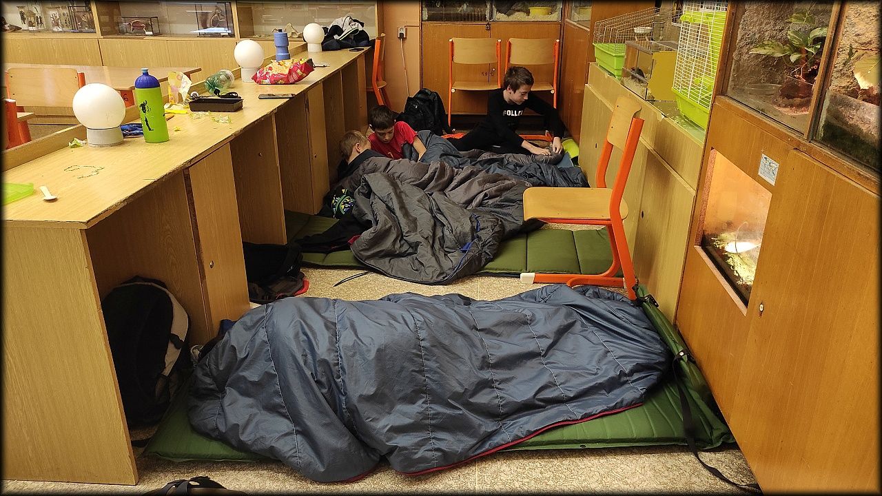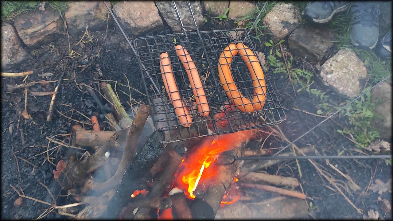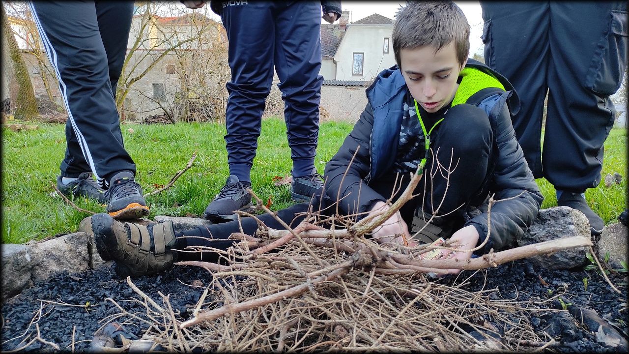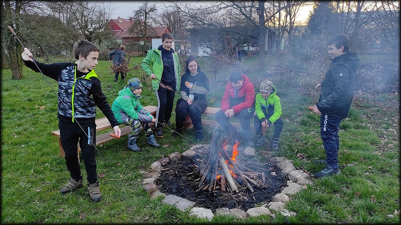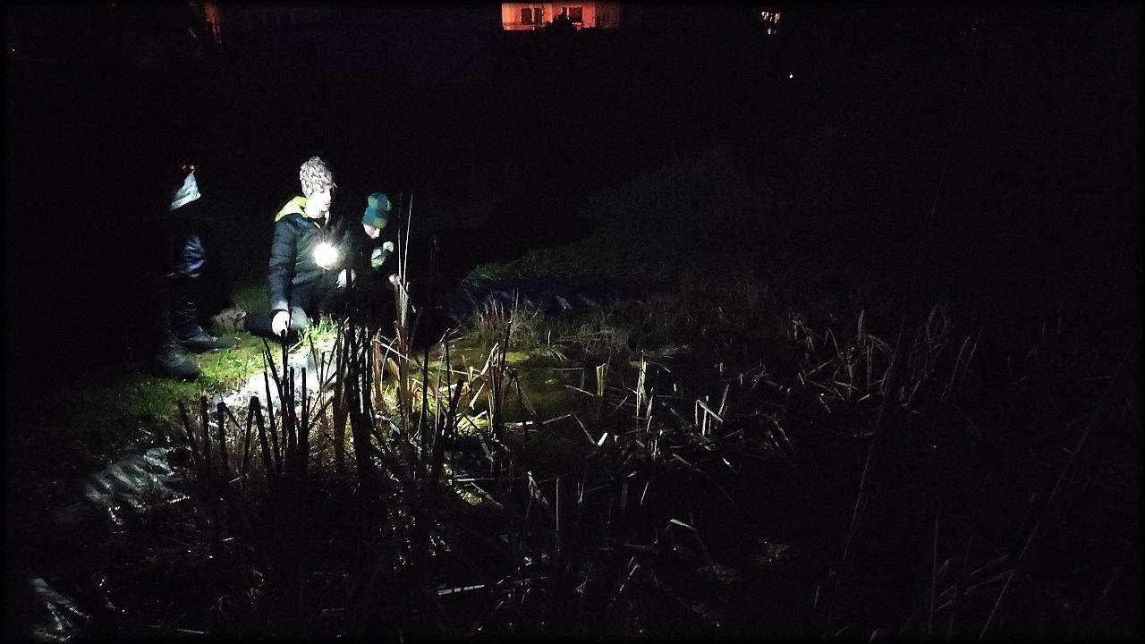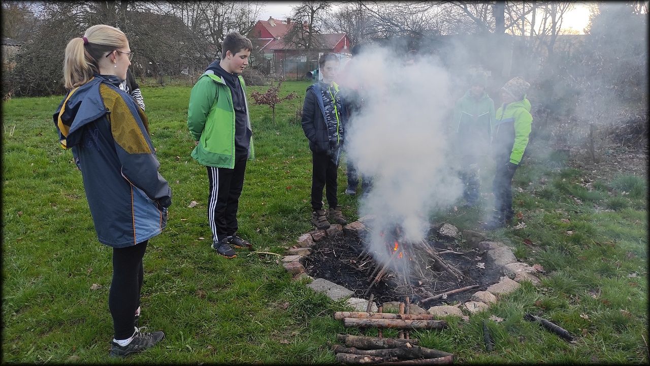 Nejprve jsme ovšem zašli na pozemek, připravit si večeři. Počasí bylo milosrdné a našla se mezera mezi dešťovými mraky, potřebná právě na rozdělání ohně a opečení buřtů. Již za tmy jsme nahlédli i na život v jezírku. A s kapkami deště jsme se rádi odebrali zpět do sucha a tepla školy.