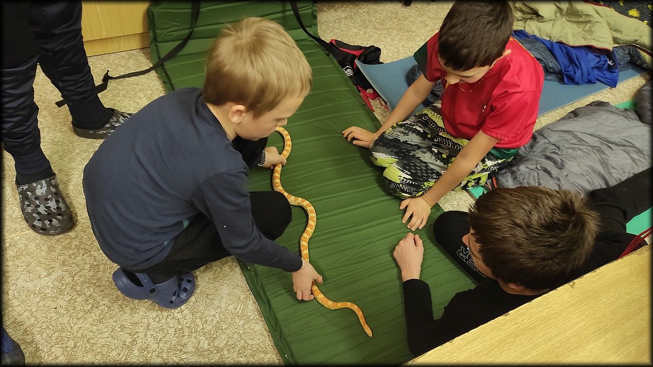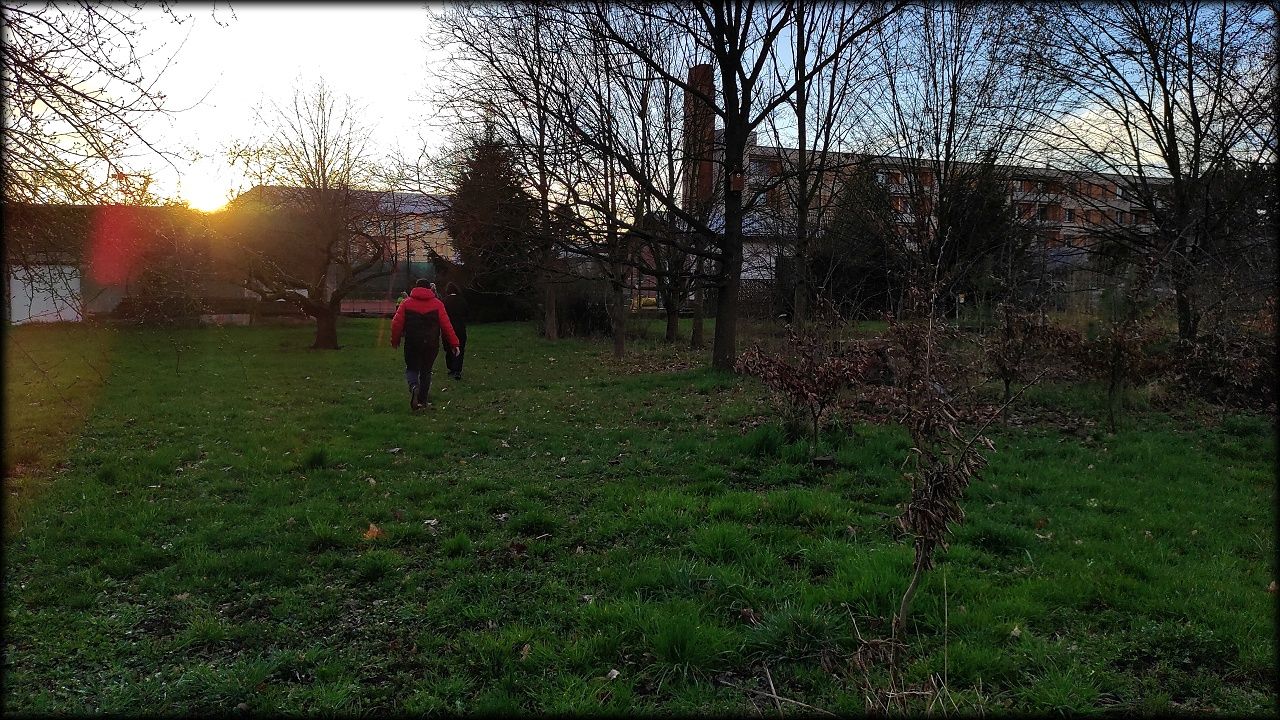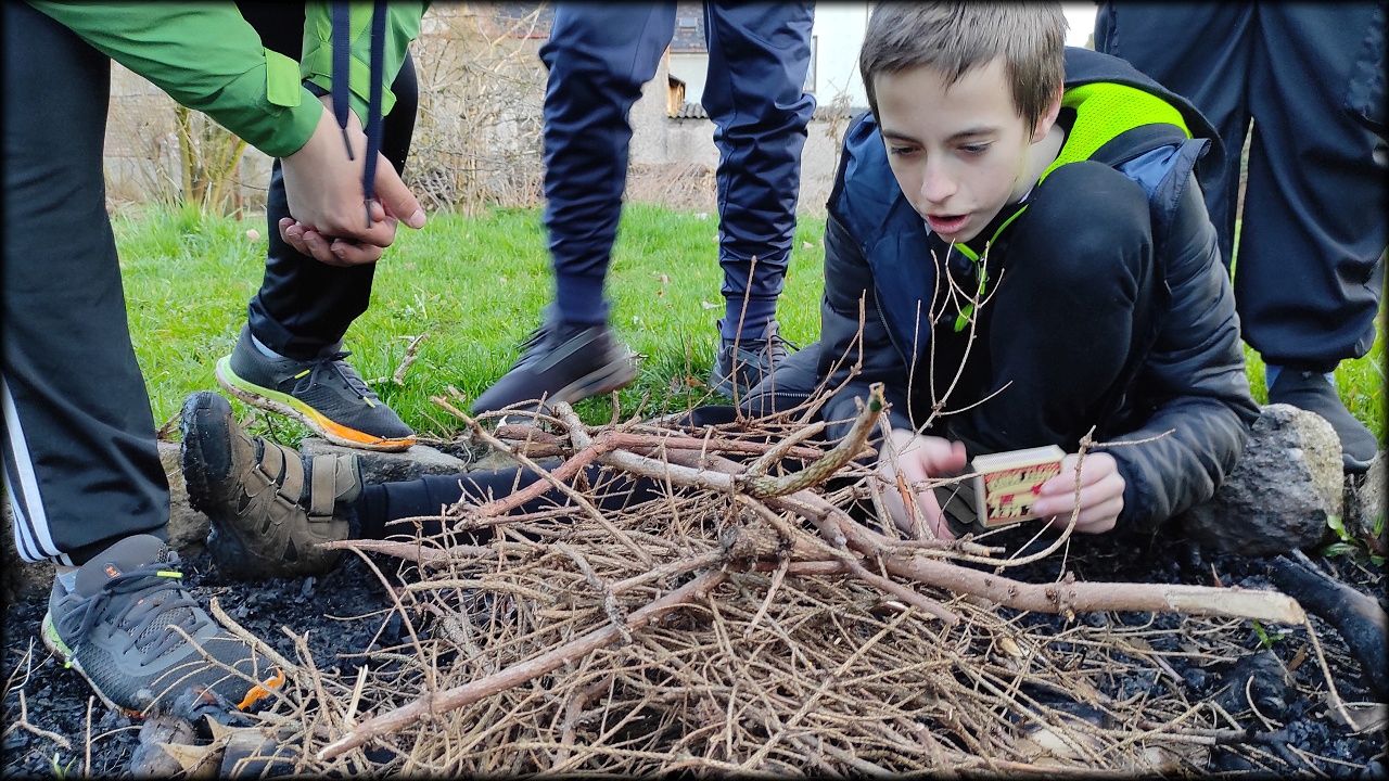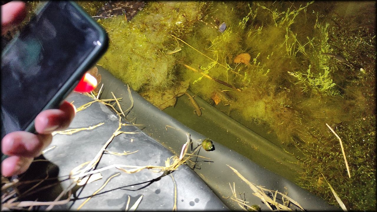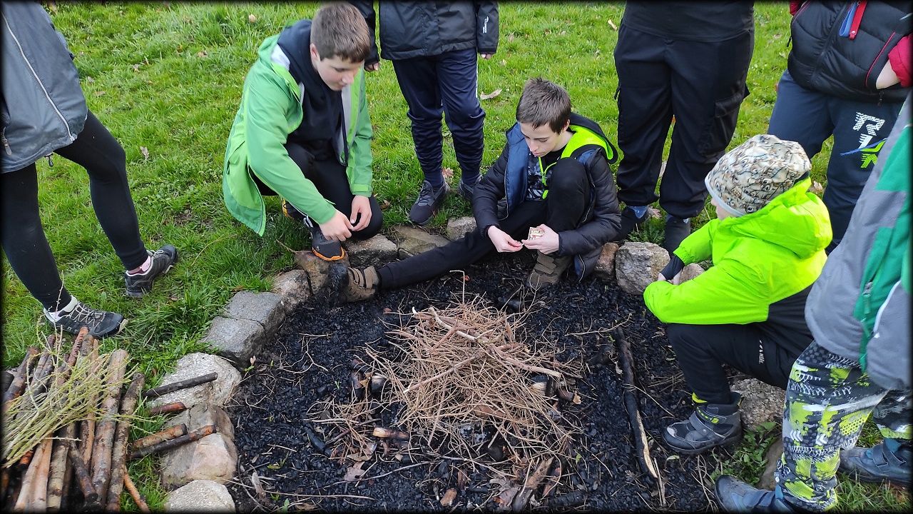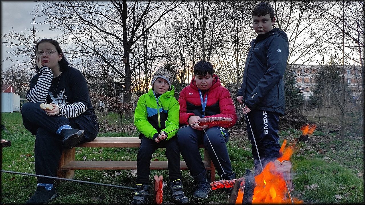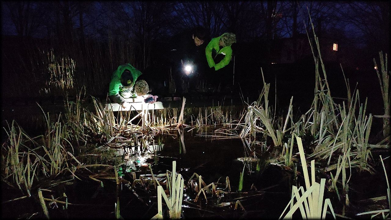 Nejprve jsme ovšem zašli na pozemek, připravit si večeři. Počasí bylo milosrdné a našla se mezera mezi dešťovými mraky, potřebná právě na rozdělání ohně a opečení buřtů. Již za tmy jsme nahlédli i na život v jezírku. A s kapkami deště jsme se rádi odebrali zpět do sucha a tepla školy.