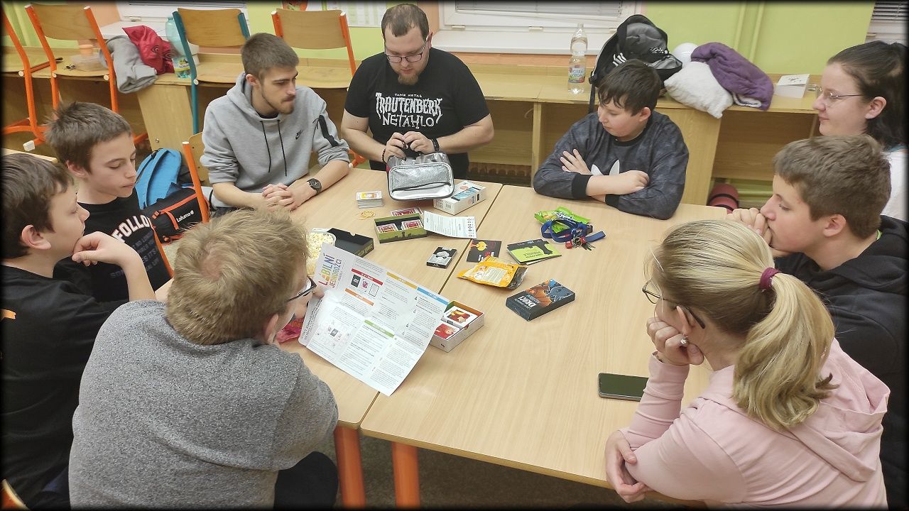 V pátek večer dorazili na milou návštěvu Ondra a Karel. Spolu s Pavlem přinesli deskové a karetní hry a my jsme si tak mohli vyzkoušet i aktivity, které v kroužku nemáme.