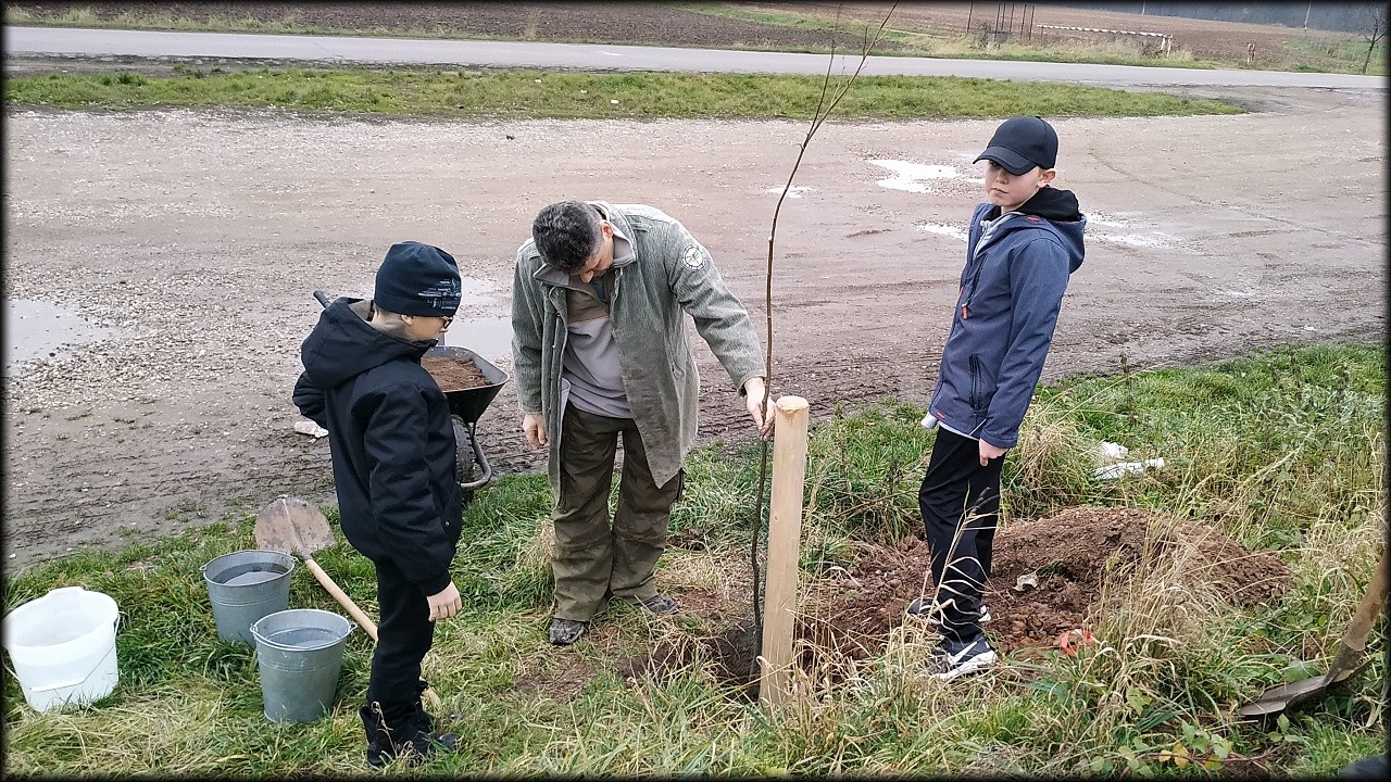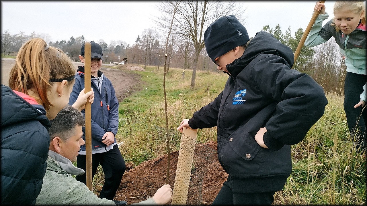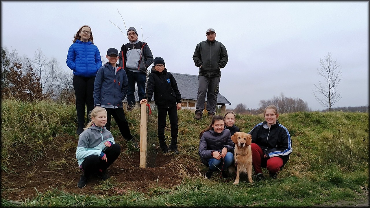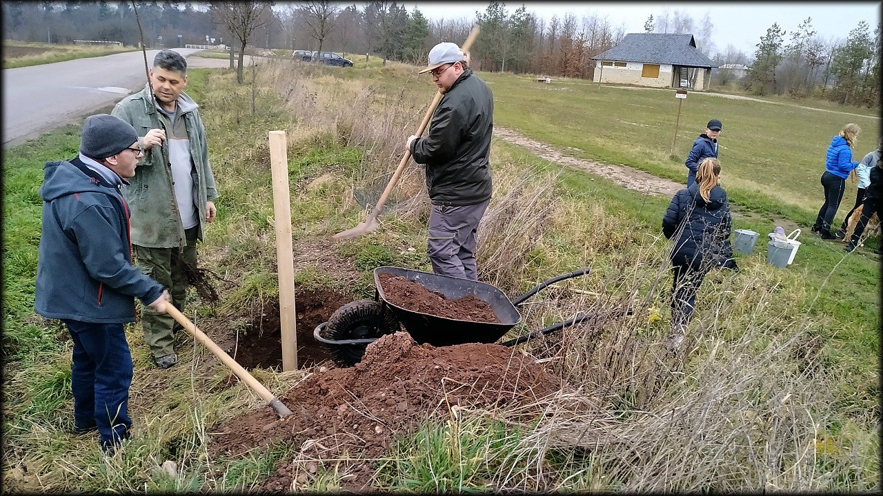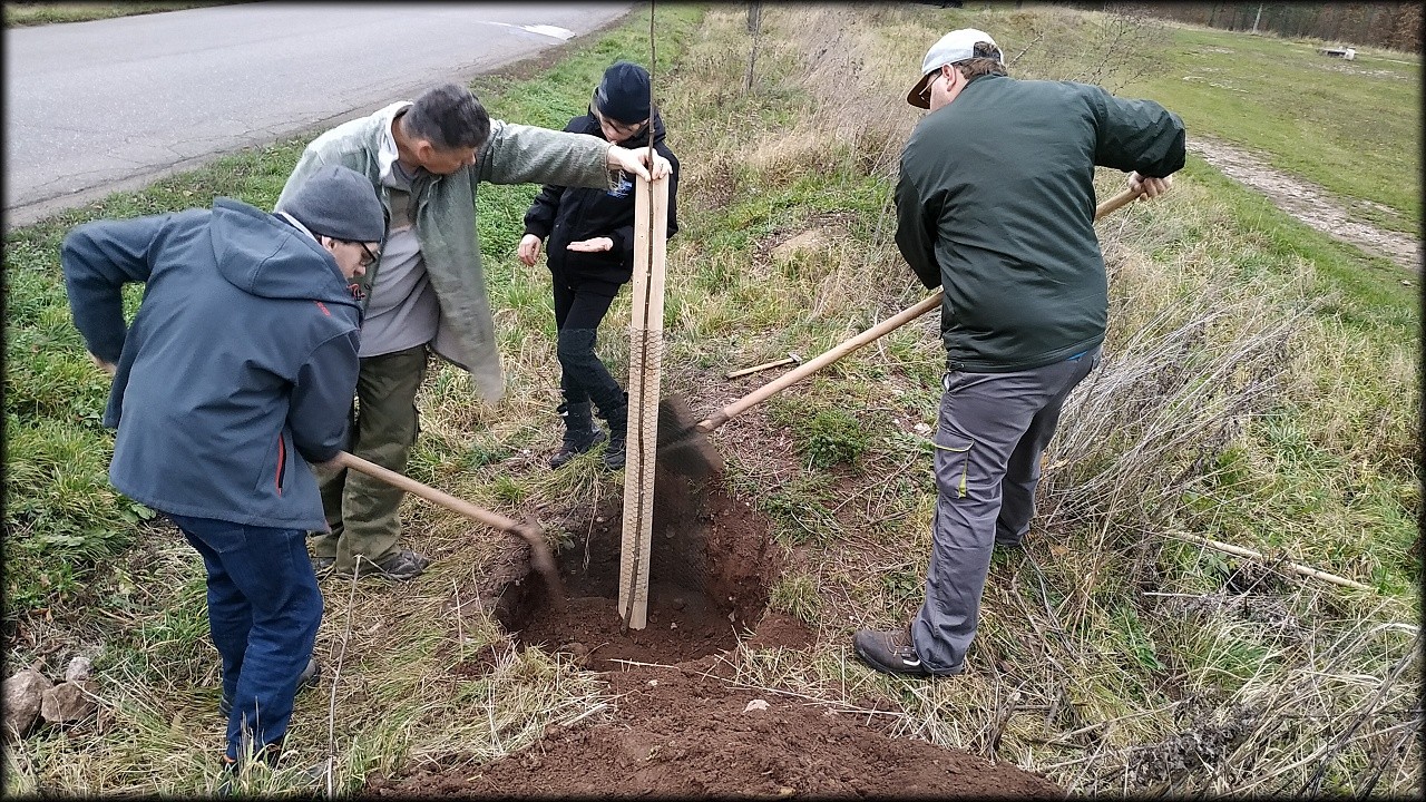 Bylo sice větrné, ale na listopad pořád krásné počasí. Tak jsme toho využili k výsadbě stromků. Vlastně, k doplnění lipové aleje, kterou jsme u parkoviště vysadili přesně před patnácti lety.